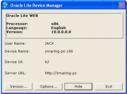 For Windows-based devices only, the fourth section details the version of the JDK that you have installed and where it is installed. You no longer have to ask your users to check which version of JDK that they have installed. For example, in the Oracle Database Lite 10g, if you are using Oracle Application Server (9.0.4), you must be using the JDK 1.4.2. You can view this information for each device and know if the Mobile client software must be upgraded or not. In addition, this section describes the CLASSPATH for the Mobile client environment.