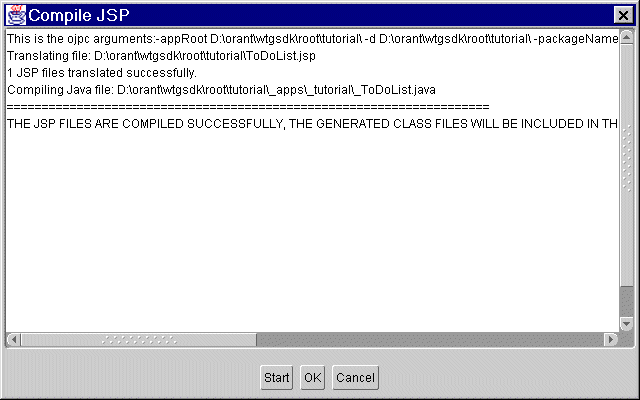 The 'Compile JSP' button enables you to compile your JSP files for deployment. If you click the 'Compile JSP' button, the following 'Compile JSP' dialog appears with detailed compilation information. If there are any errors, you should correct the JSP files before proceeding.