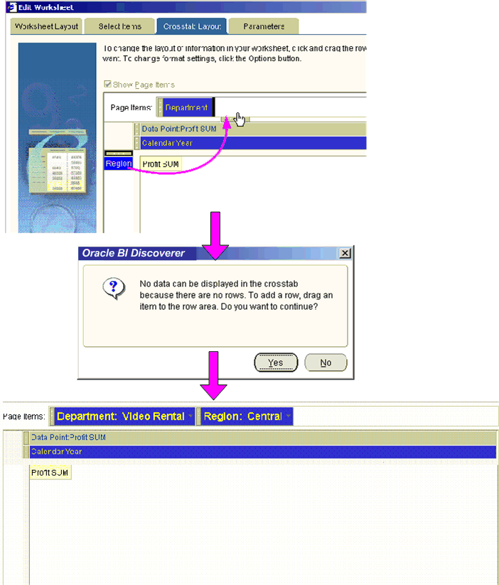 Hint: To help you pivot items, ensure that the item labels are displayed in the Crosstab Layout tab. To display item names, choose Edit | Worksheet from the main Discoverer menu, click Properties, display the Sheet Properties tab, and select the Show item labels check box.