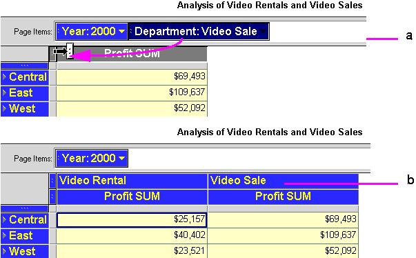 Pivoting a column on a table from the body to the page axis or from the page axis to the body rearranges the order of the data as it is presented and helps you organize the data. On a crosstab, however, pivoting a column has a much different meaning because the positions of data columns determine the data interrelationships of the items on the crosstab. Therefore, pivoting a column on a crosstab not only changes the positions of the data—you may see different numerical values as the data relationships vary. Figures 4-1 and 4-2 provide examples of pivoting on tables and crosstabs.