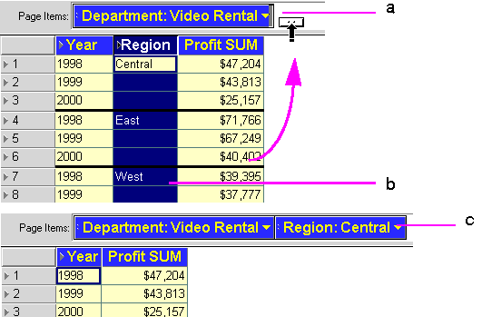 Because the data relationships on a crosstab depend on the intersection of the rows and columns, pivoting data from one axis to another creates a new set of data relationships. In addition, the new arrangement can add levels of data to an axis. For example, if the data on the side axis is organized into three levels such as Region, City, and Store Name, pivoting the Year item to the side axis adds a fourth level of data to that axis, (see Figure 4-8 for an example).