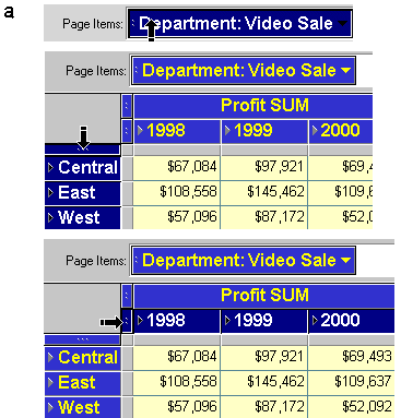When the page axis contains data, the table or crosstab displays one page of data at a time. A page displays all of the data for a particular data item, such as the profits from Video Rentals for 1996.