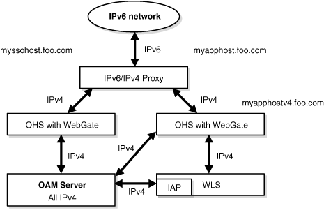 In this configuration you have multiple proxies: for example a separate proxy for the authentication WebGate and another proxy for the resource WebGate. You can access the application from a browser on the IPv4 network directly to an IPv4 server host name with a login redirect to an IPv6 host. For example:
