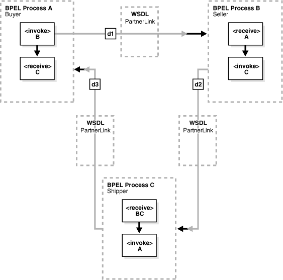 In a synchronous interaction, a client sends a request to a service (d1 in Figure 6-2), and receives an immediate reply (d2 in Figure 6-2). A BPEL process service component can be at either end of this interaction, and must be coded based on its role as either the client or the service. For example, a user requests a subscription to an online newspaper and immediately receives email confirmation that their request has been accepted. Example 6-2 shows the portType and operation part of the BPEL process WSDL file for this environment.