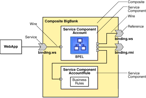 Figure 1-2 provides an example of a composite that includes an inbound service binding component, a BPEL process service component (named Account), a business rules service component (named AccountRule), and two outbound reference binding components. The details of this composite are stored in the composite.xml file.