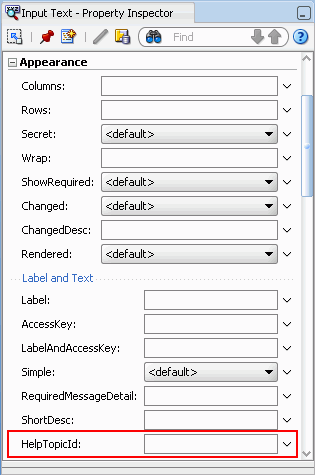 To associate a help topic with an ADF component, you must assign the help topic's unique id as the HelpTopicId attribute's value. The HelpTopicId attribute is available in the Appearance section of Property Inspector.