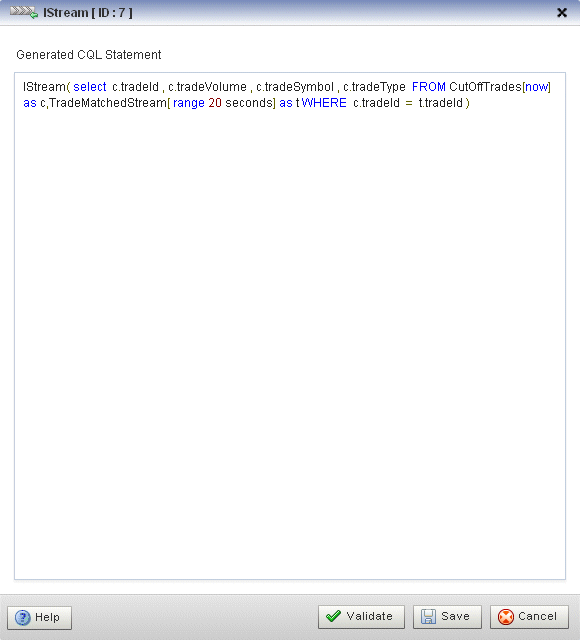 For more information about adding user-defined Oracle CQL statement templates, see Section 6.1.10, "How to Create an Oracle CQL Template for the Query Wizard".To construct the query one operator at a time or to add additional operators to a template-based Oracle CQL statement: