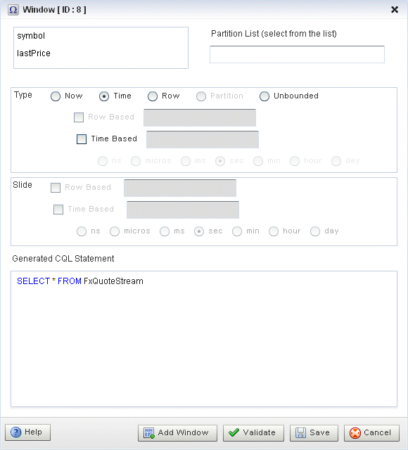 Oracle CEP Visualizer provides a sophisticated Query Wizard to simplify Oracle CQL view and query construction. You can drag and drop Oracle CQL elements to construct a view or query or you can drag and drop a complete Oracle CQL view or query template and customize it to suit your needs. The Oracle CQL Query Wizard is designed to allow business users to efficiently create syntactically correct Oracle CQL views and queries and apply them immediately to a deployed Oracle CEP application.