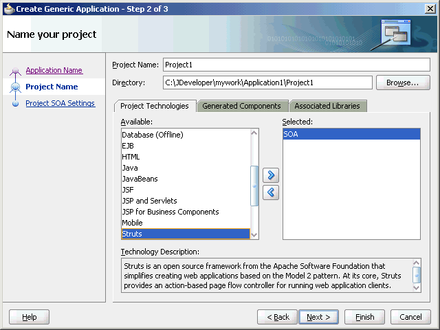 In the Available list in the Project Technologies tab, double-click SOA to move it to the Selected list.