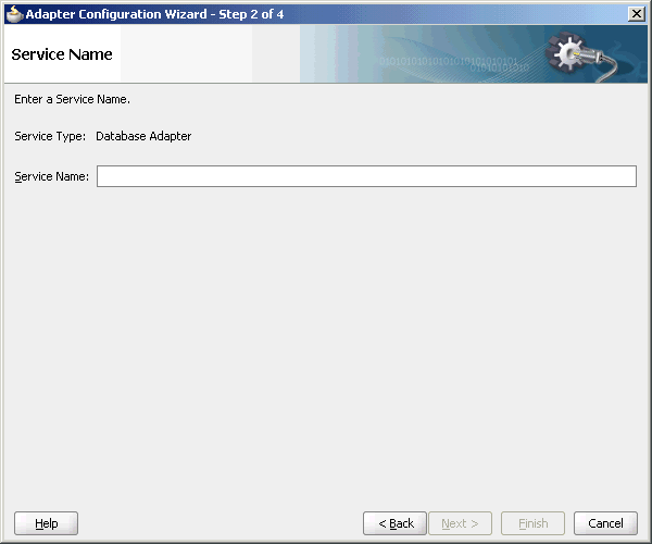 To create an Oracle Database Adapter service as part of a BPEL process, drag and drop a BPEL process from Service Components onto Components. Double-click it. Then, in the BPEL Component Palette, drag and drop Database Adapter from BPEL Services onto one of the Partner Links swim lanes.Click Next. The Service Name page is displayed, as shown in Figure 9-6. Enter the following information: