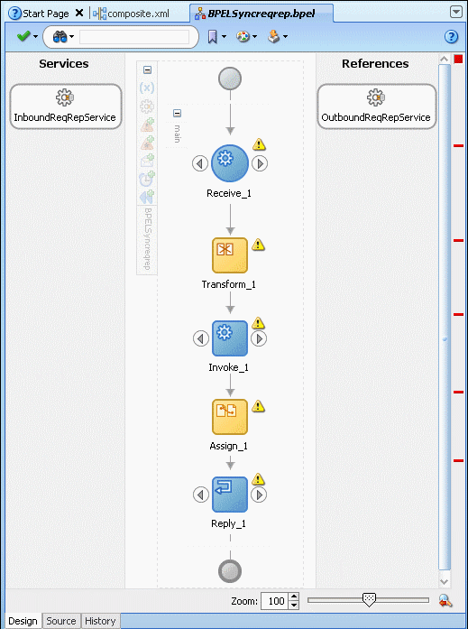 Double-click BPELAsyncreqrep. The BPELAsyncreqrep.bpel page is displayed.