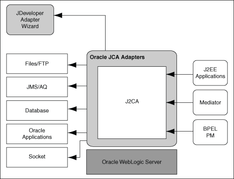 Support seamless integration with Oracle Application Server components: Adapters integrate with Oracle Fusion Middleware. Adapters integrate with the JCA Binding Component of the Oracle Fusion Middleware platform, thereby seamlessly integrating with other service engines and binding components.