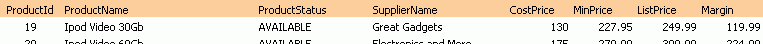 Figure 7-9 shows the columns that an ADF Read-only Table component which references the ProductList tree binding in the ExcelReadOnlyPageDef.xml page definition file of the Master Price List module renders at runtime.