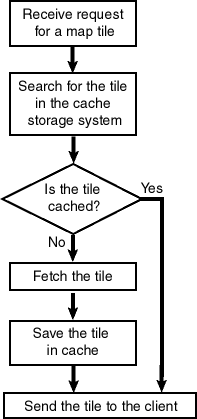 As shown in Figure 8-4, when the map tile server receives a request for a map tile, it searches for the tile in the cache storage system. If the tile is cached, the map tile server sends the tile to the client. If the tile is not cached, the map tile server fetches the tile, saves in the cache, and sends it to the client.