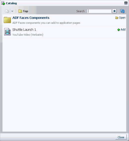 A default Resource Catalog is configured for the application. At runtime, Oracle Composer provides an option to add content to the page from this Resource Catalog.