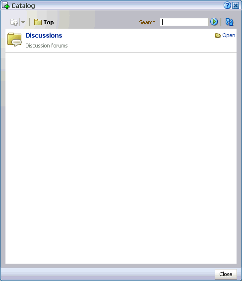 This example describes the procedure for adding a Discussions folder to the Resource Catalog. The Discussions folder contains the Discussions service main view task flow as a resource.