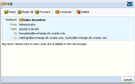 The Mail service conveniently exposes familiar mail functionality in your WebCenter application interface. The Mail service runs against the same mail server that provides your regular business e-mail. The mail messages exposed in your WebCenter application are the same messages you would see in your regular mail inbox. Many of the same actions are also supported. For example, you can send messages with attachments, forward messages, and so on.