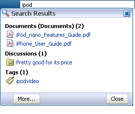 In Figure 29-3, notice that search results are segregated into groups. The first group shows how many hits resulted from documents (2). The second group shows how many hits resulted from discussions (1). The third group shows how many hits resulted from tags (1).Click a link to open a result.