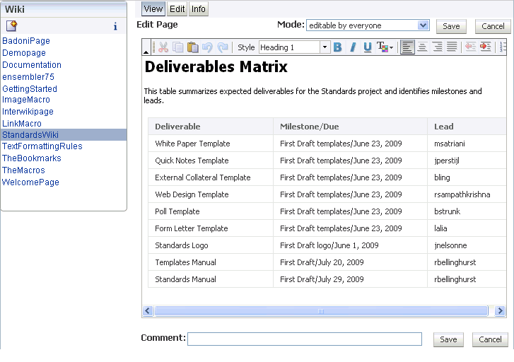 Notice the absence of the page banner, links, search, and the General heading with all of its associated links. Use this mode when embedding wiki pages into a portal or custom application.