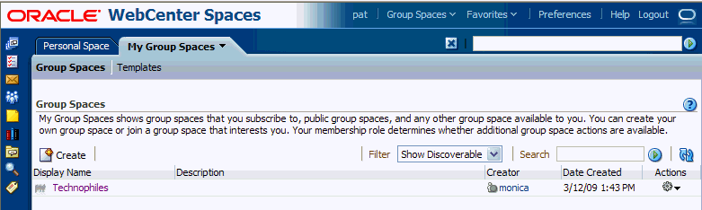 When a WebCenter Spaces user (let's say, Pat) goes to My Group Spaces and changes the filter to Show Discoverable, Pat will see the Technophiles group space, as shown in this example: