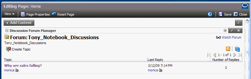 When unauthenticated users (those who do not have log in accounts for WebCenter Spaces) visit this instance of WebCenter Spaces, they'll see the Tony Notebook Discussions group space and have the ability to respond to this topic, as well as contribute topics of their own. Authenticated users will see the group space open alongside their personal space, as shown here for the user Asok: