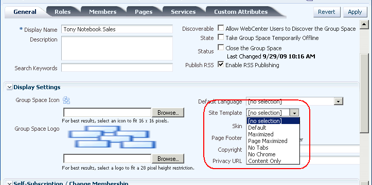 A site template determines how your group space pages display on the screen. You can set things up so that tabs or the toolbar are suppressed, for example, or have each page open in full-screen mode. By default, your group spaces use the site template selected by your WebCenter Spaces administrator, but you can override this setting just for the Tony Notebook Sales group space. Let's see how this is done.
