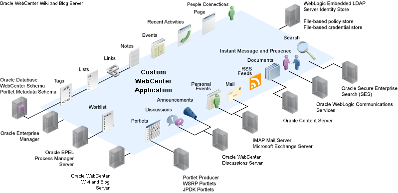 The diagram in Figure 23-2 shows a basic WebCenter application after deployment with its back-end server connections.
