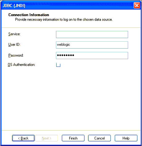 | Note: | The Database drop down box is populated with the available catalogs (AquaLogic Data Services Platform applications) once you have specified the correct parameters for User ID and Password as shown in Figure 5-3. |