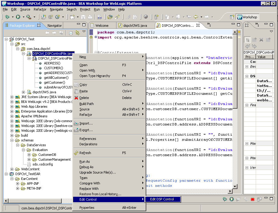 The new Web service project (DSPCtrl_Test) and EAR (DSPCtrl_EAR) are created in Workshop for WebLogic Platform 9.2, as displayed in Figure 7-23. The EAR is the same as the application in AquaLogic Data Services Platform 8.1 environment.