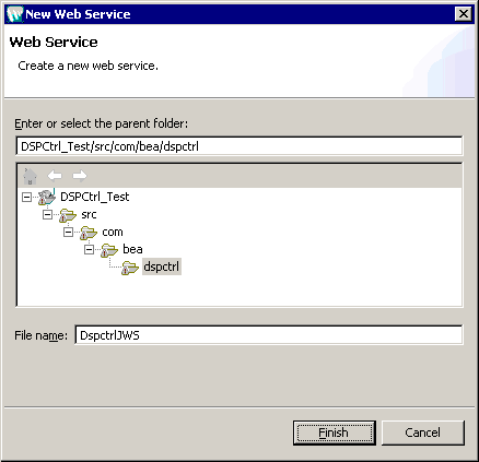 WebLogic Web Service. Specify the name of the JWS project in the File Name field as displayed in Figure 7-29.dspctrlJWS.java) and select Insert