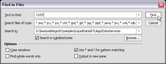 WebLogic Workshop provides a comprehensive file search facility with its Find in Files option, available from the Edit menu (Edit