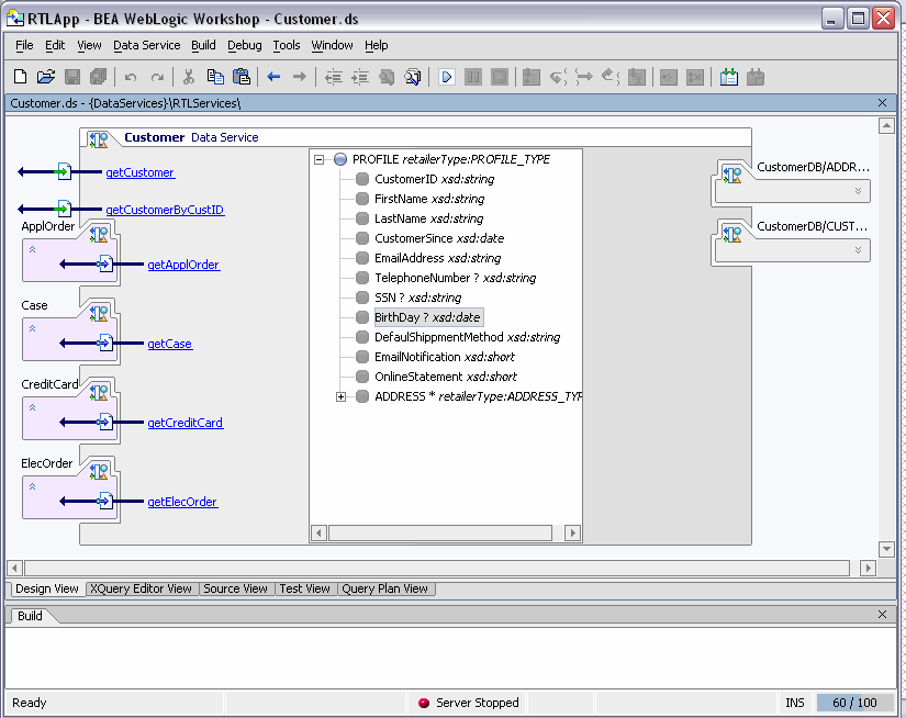 Every data service provides a Design View, XQuery Editor View, Source View, Test View, and Query Plan View. Each data service is based around a single XQuery source file. And every data service has an associated XML type (XDS file).
