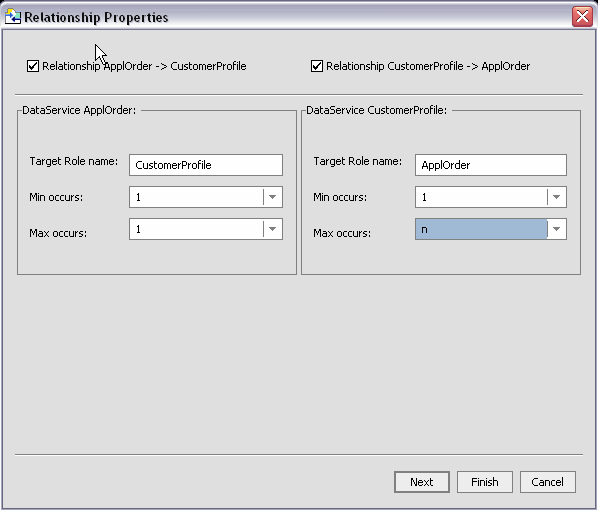 Cardinality can also be specified through the Property Editor associated with your data service or through a model diagram showing the relationship.
