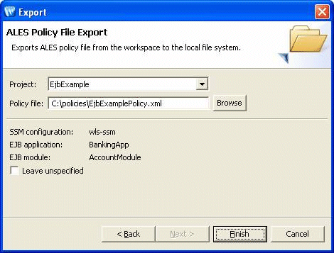 EjbExamplePolicy.xml). If the Leave unspecified checkbox is checked, the policy file will includes tokens for SSM configuration, EJB application, and EJB module instead of the values you specified for them. Later, the EJB application deployer can replace these tokens. This functionality is useful when the developer does not know all the deployment parameters of the target machine, or the EJB application is going to be deployed on multiple machines with different configurations.