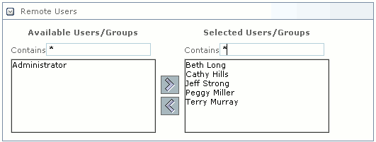 Click the arrow button next to Remote Users at the bottom of the page to display the Remote Users Selection window. The users or groups who have been given access to the local campus by remote administrators will be displayed in the Avilable Users/Groups list.