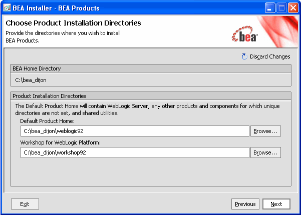 Here, C:\bea_dijon is the BEA Home directory and weblogic92 is the product installation directory for the WebLogic Server 9.2 software. However, you can specify any name and location on your system for your product installation directory; there is no requirement that you name the directory weblogic92 or create it under the BEA Home directory.