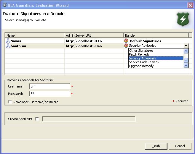 If you have multiple domains selected, every one must have its credentials filled in before you can launch the evaluation. If any of the selected domains are missing credentials, a message at the top of the dialog box says that the required credentials are missing and the Finish button is greyed out.