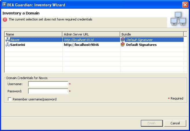 If you have multiple domains selected, every one must have its credentials filled in before you can create the inventories. If any of the selected domains are missing credentials, a message at the top of the Inventory Wizard says that the required credentials are missing and the Finish button is greyed out.