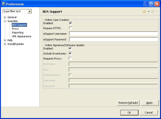 BEA Support - allows you to specify whether to use Secure Sockets Layer (SSL) encryption when creating support cases, and whether to use a proxy server when updating Guardian. Please note that Guardian uses 128 bit open source encryption for SSL.
