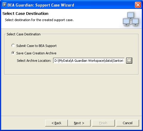 If you choose to save the case as a Case Creation Archive, you must select a folder in which to save it. BEA recommends using the data/<domain node>/Case Creation Archives folder in the Guardian Workspace location you specified when you started Guardian.