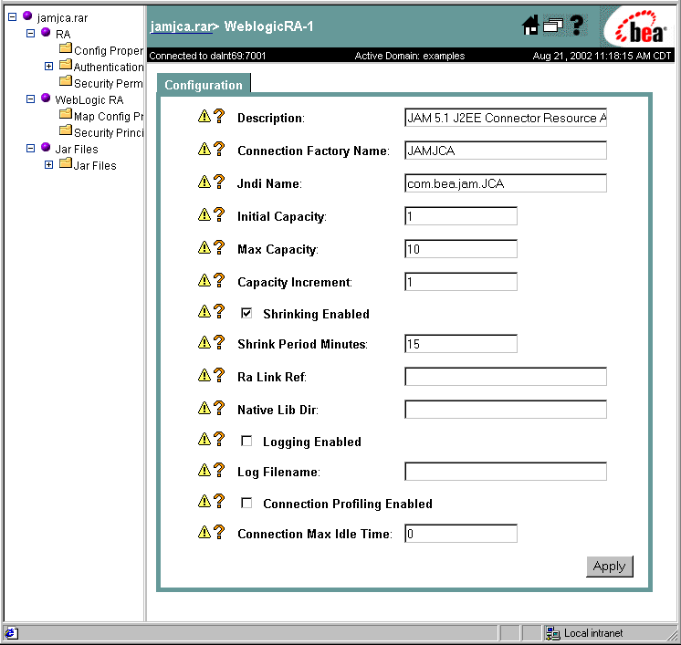 After installing the WebLogic JAM JCA Adapter, you may configure it using the Edit Connector Descriptor link of the WebLogic Administration Console. For more information on the Connector Container options in WebLogic Server, refer to the WebLogic Server documentation.
