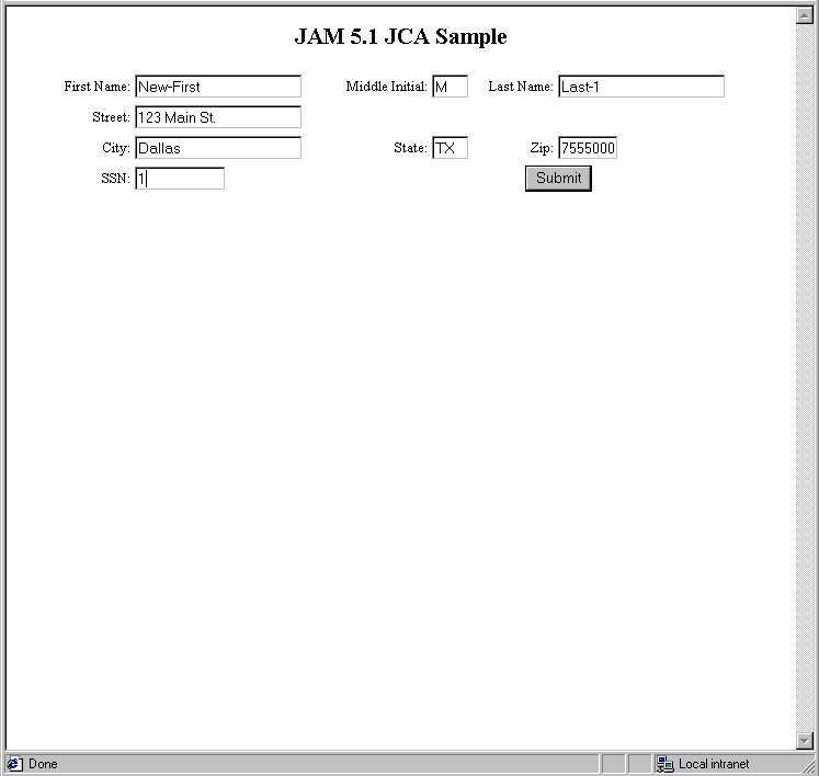 The Container Managed sample is a simple JSP page that accesses the readSample mainframe service using the EmployeeRecord which ships as a WebLogic JAM 5.1 sample.