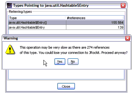 Instead of choosing the other alternative: Show instances of this type pointing to <TYPE>, where TYPE in this case is HashTable$Entry the new window that appears presents a warning for a large amount of references maybe causing the connection to the JRockit process to be lost. This means that the HashTable$Entry[ ] consumes unexpected amounts of memory and is holding on to an enormous amount of references to HashTable$Entry.