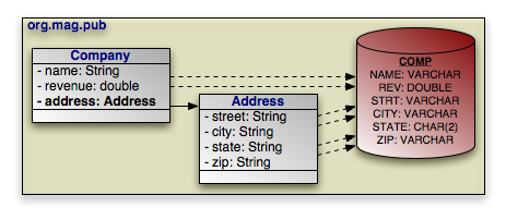 Below we present an updated diagram of our model and its associated database schema, followed by the corresponding mapping metadata. Note that the mapping metadata relies on defaults where possible. Also note that as a mapped superclass, Document can define mappings that will automatically transfer to its subclass' tables. In Section 12.8.3, “Embedded Mapping”, you will see how a subclass can override its mapped superclass' mappings.