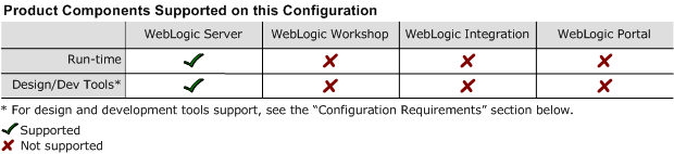 - For information about supported database configurations, Web servers, and browsers, plus support for interoperability tools and WebLogic Platform product support information, see WebLogic Platform 8.1 Supported Configurations.