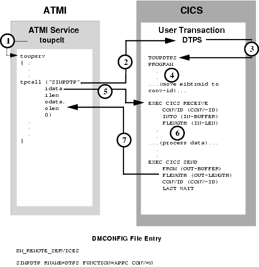 toupsrv service issues tpcall for SIMPCPIC, which is advertised in the DM_REMOTE_SERVICES section of the DMCONFIG file. Data is sent from the idata buffer on the tpconnect.