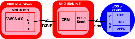 The Tuxedo Mainframe Adapter Gateway is the transactional SNA gateway. It is implemented as an ATMI domain gateway and uses the ATMI environments. The gateway communicates over a Transmission Control Protocol/Internet Protocol (TCP/IP) connection with the CRM.