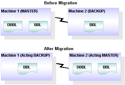 A master migration is the process of moving the DBBL from the configured MASTER machine to the configured BACKUP machine so that servers can continue to be serviced while the configured MASTER machine is down. To start a migration, an administrator requests that the configured BACKUP assume the role of acting MASTER, and the configured MASTER, the role of acting BACKUP. The acting MASTER then performs all administrative functions: it begins monitoring other machines in the configuration and accepts any dynamic reconfiguration changes.