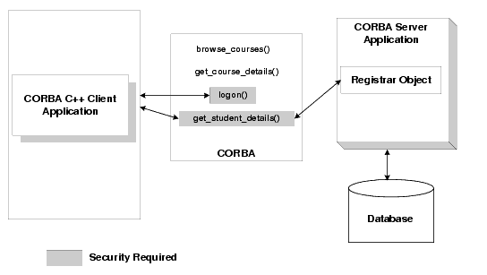 logon() operation. This operation invokes operations on the PrincipalAuthenticator object, which is obtained as part of the process of logging on to access the domain.get_student_details() operation on the Registrar object to return information about a student. After the user is authenticated, logon is complete and the get_student_details() operation accesses the student information in the database to obtain the student information needed by the client logon operation.| Note: | Certificate authentication is illustrated in the Secure Simpapp sample application. |
