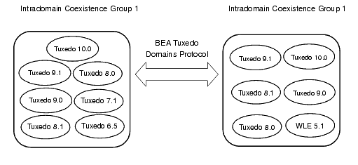 BEA Tuxedo 10.0 can coexist in the same domain with Tuxedo 9.1, 9.0, 8.1, 8.0, 7.1, and 6.5. BEA Tuxedo 10.0 can also coexist in the same domain with Tuxedo 9.1, 9.0, 8.1 and WebLogic Enterprise 5.1.